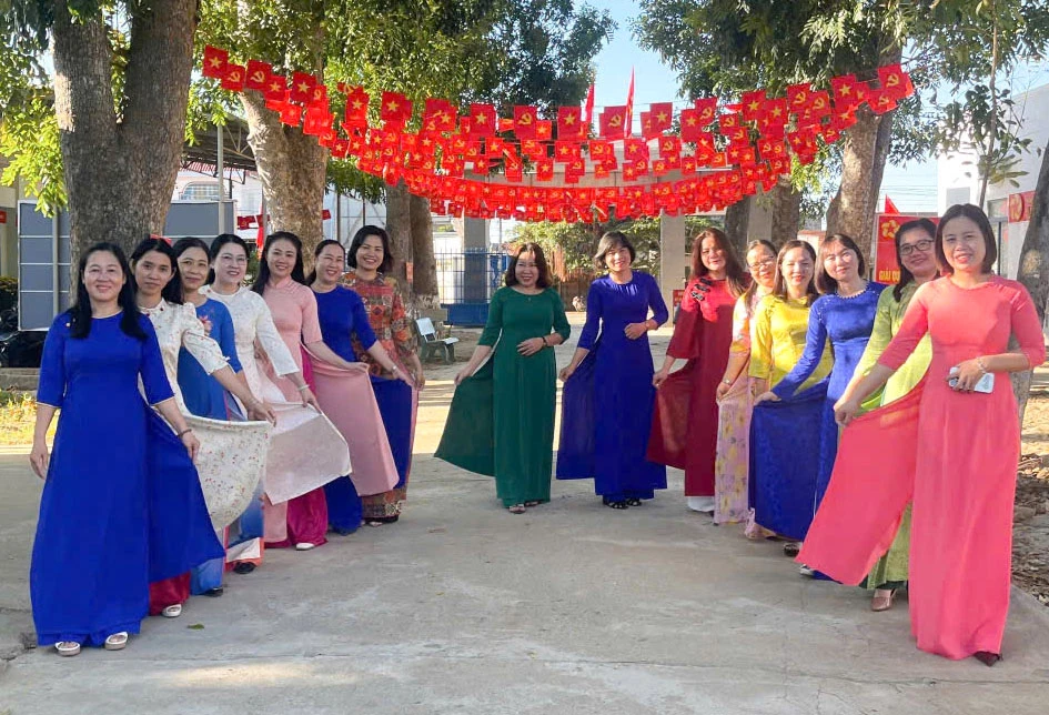 Phụ nữ xã Phước Hậu rạng rỡ nụ cười trong trang phục áo dài.